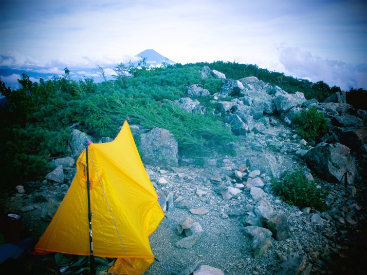 | 記録 | 車は軽自動車で時速100qになると「スピードに注意ください」中央車線や路側線を踏むとブザーが注意を促してくれる老人向けの車仕様となっていて助かります。 奈良田湖駐車場着くと車が20台近く停まっていてみんな笹山かと思ったが。釣人と広河原に向かう登山者だと分かった。登山口まで歩いて偵察を行って車中泊とします。蒸し暑かった車内も次第に冷え込んできて足元が寒くなってきて、我が家の庭から見上げる星空は夏の三角形と白鳥座にカシオペア位ですが、ちりばめられて星空は星座なんか確認もできません。5:00近くになって明るくなってきたので出発します。 吊橋を渡って登山口の標識を過ぎると杉林の中の鉄パイプの手摺に導かれて送水管上に、これから本格的な山道に入り尾根合流点まで標高差524mを2時間40分の予定だったのが2時間ジャストと順調な滑り出しです。 若者二人から抜かれて、彼らは笹山から広河内岳を越えて大門沢を下るそうです。 樹林帯の中なので陽射しは遮られていて水場入口でも予定より40分短縮、窪地2256mでは30分短縮とだんだん余裕がなくなっているのが自分でもわかります。 とにかく急坂の連続で足元のみを見つめながら、時折アキノキリンソウ・ゴゼンタイバナ・カニコウモリソウ・オタカラソウ等の花が目につきます。振り返ると富士山が樹幹から覗いていて奥に見えてくるのは南峰でしょうか。 南峰の標識が建つ広場にひょっこりと。ついに自分の足で自力で立つことができ「山梨百名山達成」ですが特に感情が湧くことが無いのは疲れの性でしょうか。 仲間にラインで送って驚かせているのが嬉しいです。 北峰に立つと南アルプスの山々が流れる雲の中に見え隠れして圧巻の展望を繰り広げてくれていて、マップを出して一座一座山座同定を始めます。 目の前に塩見岳・登りたかった蝙蝠岳・荒川岳・その奥に覗くのは赤石岳・聖岳・ツインピークの笊ケ岳にガスが切れると白河内岳に大籠岳に大門沢からの下降尾根、そして農鳥岳に間ノ岳に北岳に恰好良いピラミダルな甲斐駒ヶ岳です。 その右手には鳳凰三山に地藏岳のオペリスクも確認できます。 もちろん富士山は背後に大きくそびえていて、日本最高峰三山を同時に眺められます。 山々を眺めつくしたので今晩のネグラの設営です。軽量化目的でツエルトのみで山頂直下におストックを支柱にして何とか恰好が付いたように見えます。 行動食に毛の生えたような簡素な食事はあまり喉を通りません。もちろんアルコールもなしです。寒くなる前に一寝入りと思って横になりますが小一時間程度で目が覚めます。 ツエルトの下から風が容赦なく吹き込んできて、石を防風代わりに積んだりしますが効果はあまりないようです。シュラフも当然持ってきていません。 朝出発の時に車で使ったのをザックに入れようかなーと思いましたが480gを軽量化目的で止めていました。 足に小スタッフザックを入れて大スタッフザックに両足を入れて更にザックの中に突っ込んでレスキューシートで下半身を包みます。腰から上は半袖・長袖シャツ・ウインドブレーカー・雨具は上下を着用、首にはネックウォーマーとタオルですが暖をとるものはなしです。 寒くて寒くて、風を避けるためついに山頂から樹林帯に降りて岩に寄りかかりツエルトを被って満月を眺めながら時間経過を待つのみです。雲が出ていて星空になっていないので冷え込みは少ないはずなのに身体が手が震えてきます。ヤバいです。行動食を摂ると身体が暖かくなり小一時間程度眠れ、又行動食を摂ります。早く山を下ろうと荷物をまとめて南峰に移動して夜明けを待ちます。 富士山の背景の空が茜色に燃えてきて神々しく感じますが、山には朝日が当たらなく南アルプスは燃えてくれなく残念です。こんなに寒い思いをしたのにと思いますがもう一度全容をみせてくれるだけでうれしいものです。 明るくなってきてメボソムシクイ達もお祝いの囀りを聞かせてくれて下山の途に就きます。 鳳凰三山に小川山から奥秩父連山の金峰山も見せてくれ、登るときには余裕もなかったのだなーと苦笑します。 順調に下っているようだったが足が重くなってきて水場入口では予定タイムより50分も遅れている。両足大腿筋に力が入らなくなって踏ん張りが利かなくなってきた。ガス欠かなーと思って行動食を口にすると幾分持ち直してきた。 尾根合流点を過ぎるとひどくなってきて尻餅をつく回数が増えてきて、最近の山遭難も下山時に歩けなくなったとのニュースもあり自分もそうなるかなーと考えたりした。 送水管上まで降りてくると鉄パイプに縋りながらも遅々として足を運ぶ。杉林に中にミヤマウズラの花を数株見つけて写真を撮ったつもりだが足がふらついていたのだろう映っていなかった。 下山口から吊橋に向かって歩いていると対向車の工事関係者の人から「笹山ですか、今日の登山者は」と声を掛けられ「今日は登る人、下山者とも会うこと
